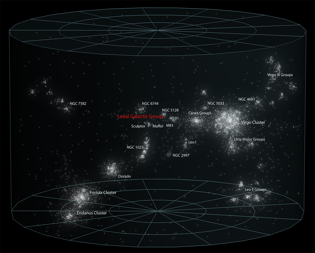 Cuando hablamos de escalas del orden de los 500 millones de años luz, el Universo adquiere un carácter homogéneo e isótropo, es decir, que tiene las mismas propiedades en todas las direcciones que lo mires. A esta escala, el Universo es una especie de red, de telaraña cósmica, formada por filamentos de cadenas de cúmulos y supercúmulos de galaxias conectados entre sí, los cuales a su vez se entrecruzan formando toda esta maraña cósmica. Los filamentos envuelven, dejan entre ellos, enormes regiones aparentemente vacías, pero que no son tal, pues contienen materia transparente y no luminosa, incluida la materia oscura.