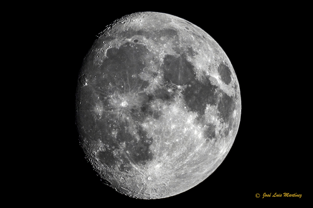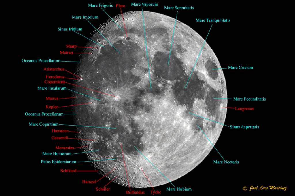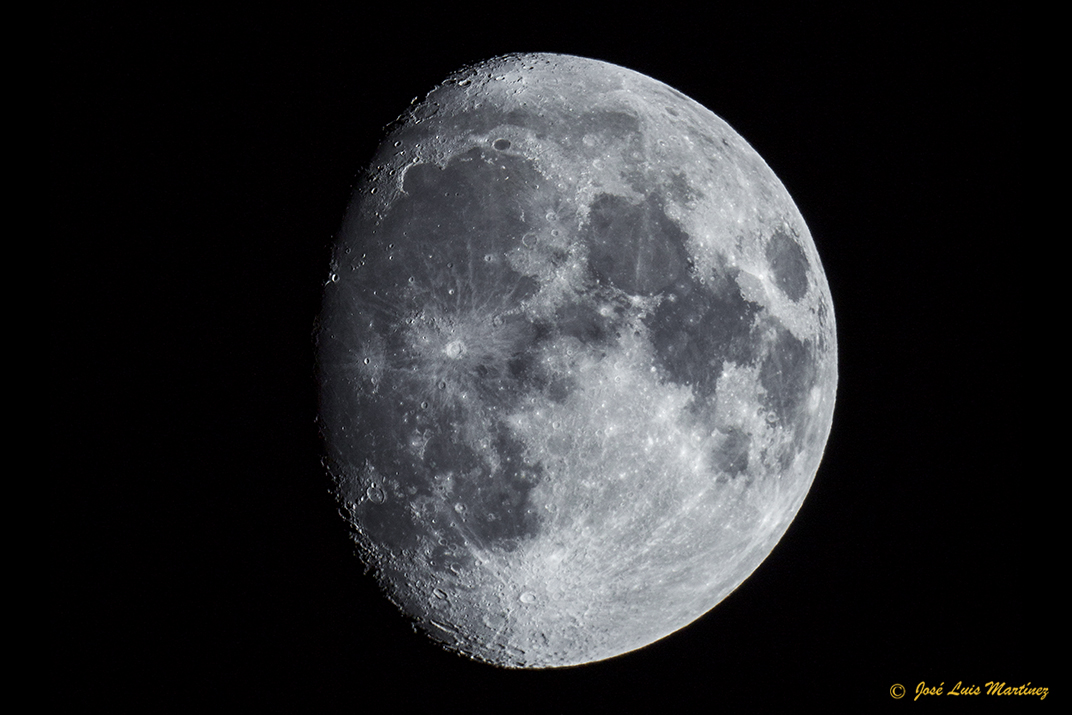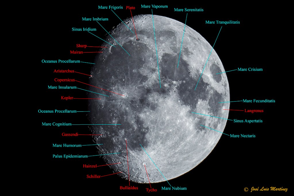 A cuatro días de Luna llena, se pueden observar todos los mare y bastantes cráteres, especialmente en la zona del terminador (″frontera″ entre el día y la noche selenita, en la cual hay un alto contraste y los cráteres se observan muy bien).