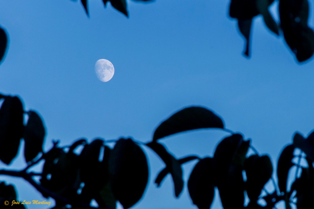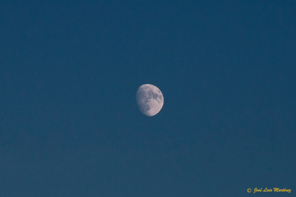 Como siempre, antes de montar el telescopio, hice unas fotografías de la Luna de día con cámara y objetivo. Una sin motivos terrestres, la siguiente.