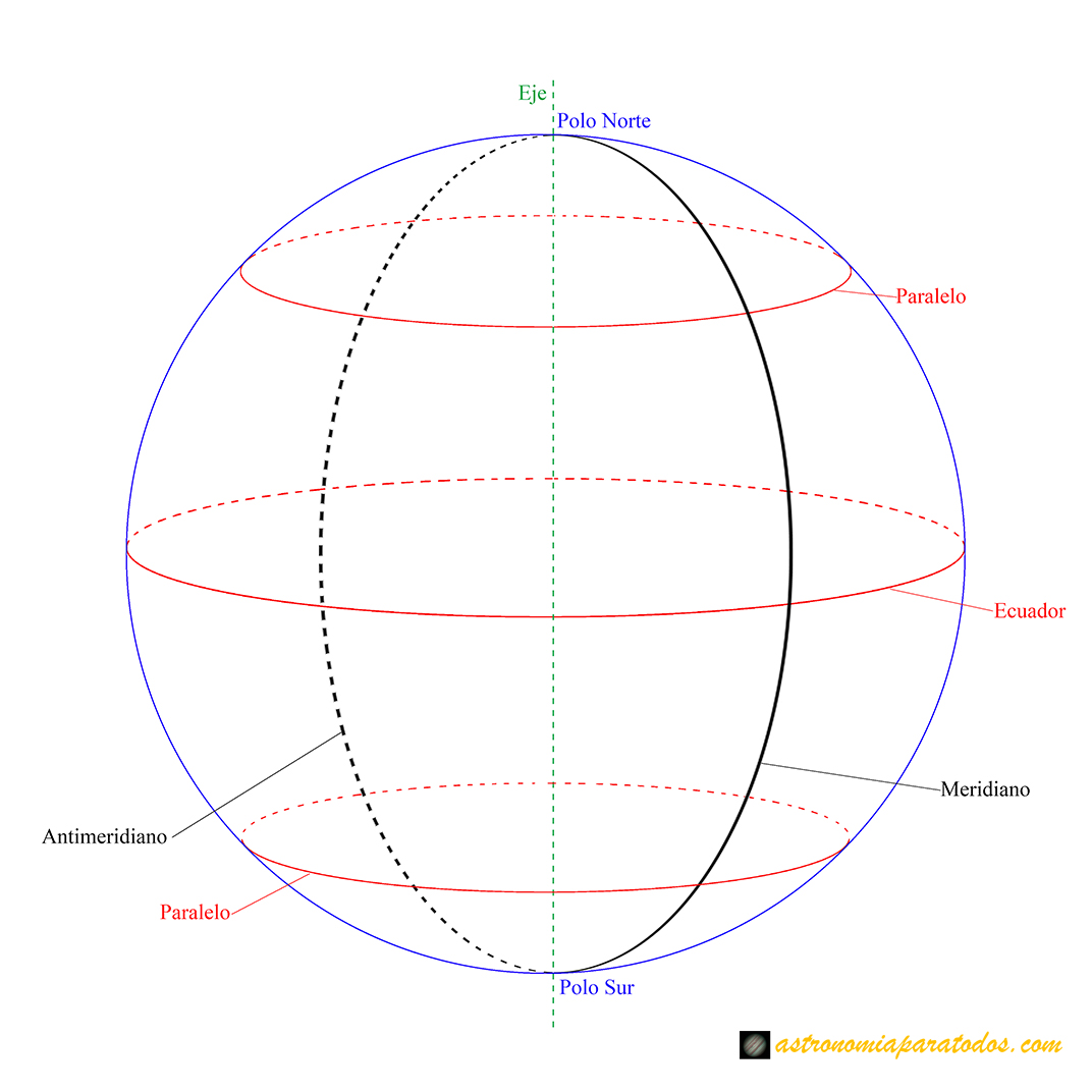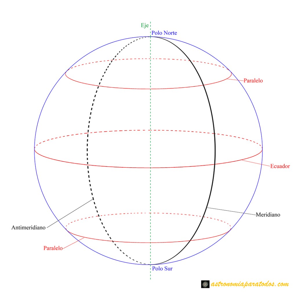 Meridianos: son semicircunferencias máximas que pasan por los Polos y son perpendiculares al Ecuador. De meridianos también hay infinitos, pero para ubicar puntos en la esfera terrestre destacan dos: el meridiano del lugar y el meridiano de Greenwich o meridiano cero. El primero es el meridiano que pasa por el punto u objeto a ubicar; el segundo es el meridiano que se toma como origen, por eso se le llama también meridiano cero. El nombre de Greenwich es porque pasa por la localidad inglesa de Greenwich. Por otro lado, un antimeridiano es un meridiano opuesto a uno dado, es decir, es un meridiano situado a 180º a uno dado.