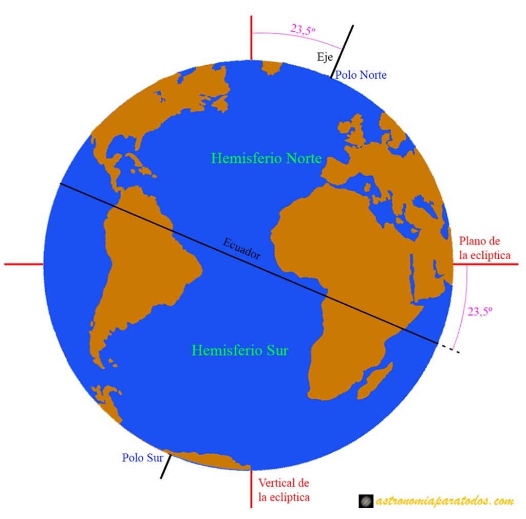 El eje de rotación de la Tierra está inclinado 23,5º respecto a la vertical del plano de la eclíptica, por lo que el Ecuador, que divide a la Tierra en dos hemisferios iguales (Hemisferio Norte y Hemisferio Sur), está a 23,5º de dicho plano.