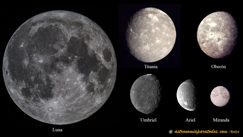 En el montaje siguiente, realizado a partir de unas imágenes de la NASA tomadas por la Voyager 2 en 1986, menos la de la Luna, que es mía, se puede ver la proporción de tamaño entre las cinco lunas más grandes de Urano y la Luna.