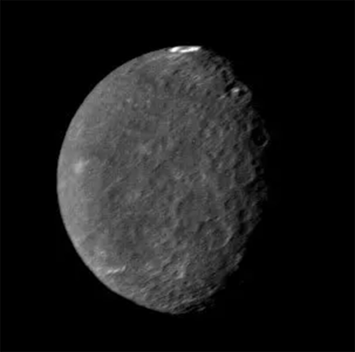 En esta luna tan oscura destaca un anillo blanco y brillante (en la imagen se observa perfectamente en la zona superior); este anillo brillante, del que se desconoce su naturaleza, cubre el fondo del cráter de impacto Wunda, de unos 130 km de diámetro.