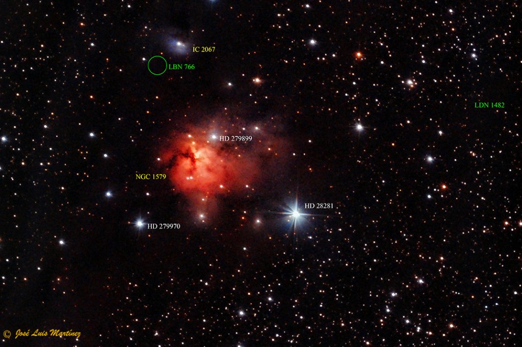Otro objeto confuso es del catálogo de nebulosas brillantes de Lynds, LBN 766. Está descrito como una región HII un poquito al sur de IC 2067 (SIMBAD y unas cuantas fuentes más), pero en esa ubicación, ni en mi imagen, ni en ninguna más de las decenas que he visto de la zona de NGC 1579, se ve nada. Hay fuentes, pocas, en las que LBN 766 es la catalogación de Lynds de NGC 1579, en lugar de LBN 767 🙄
