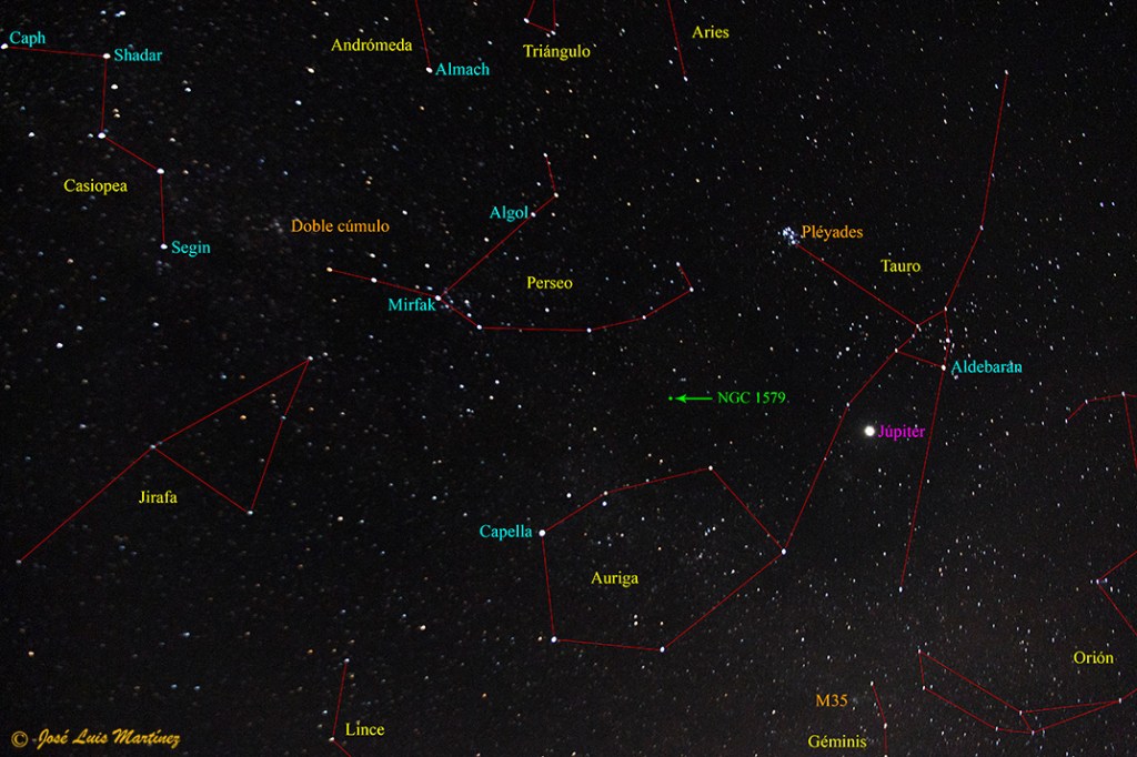 La siguiente imagen, realizada desde Querol el día 21 de diciembre de 2024, con un telescopio reflector Skywatcher 200/1000 y una cámara ZWO ASI 2600 MC Pro, es de NGC 1579. En la imagen, el norte está arriba y a la derecha.