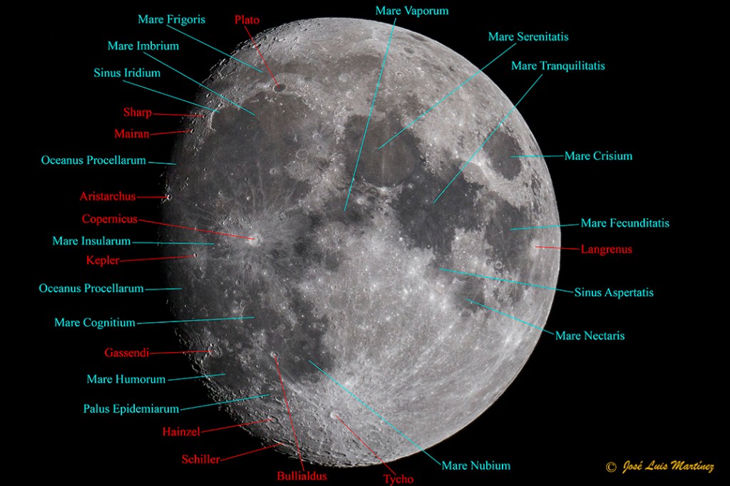 En la siguiente imagen, que es la misma que la anterior, he anotado los mare y cráteres más destacados.