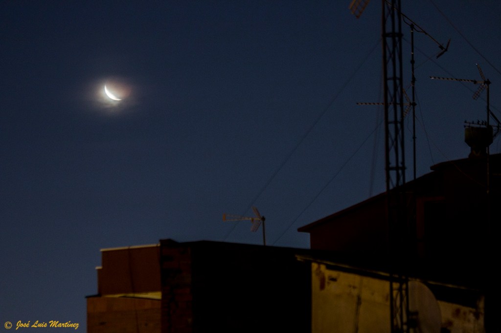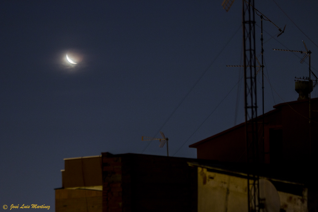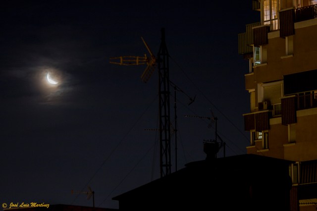Hice diversas fotos del acontecimiento, aunque unas cuantas las deseché debido a las nubes, en las que en algunas incluí motivos urbanos, como la siguiente, realizada a las 21:02 y con el objetivo a 130mm.
