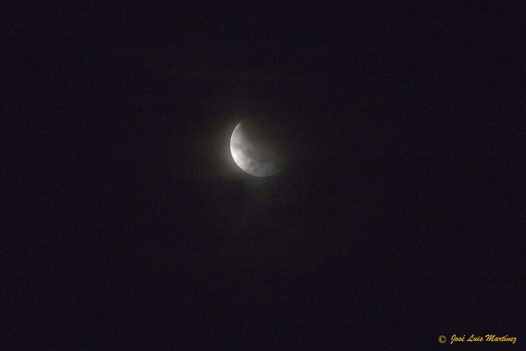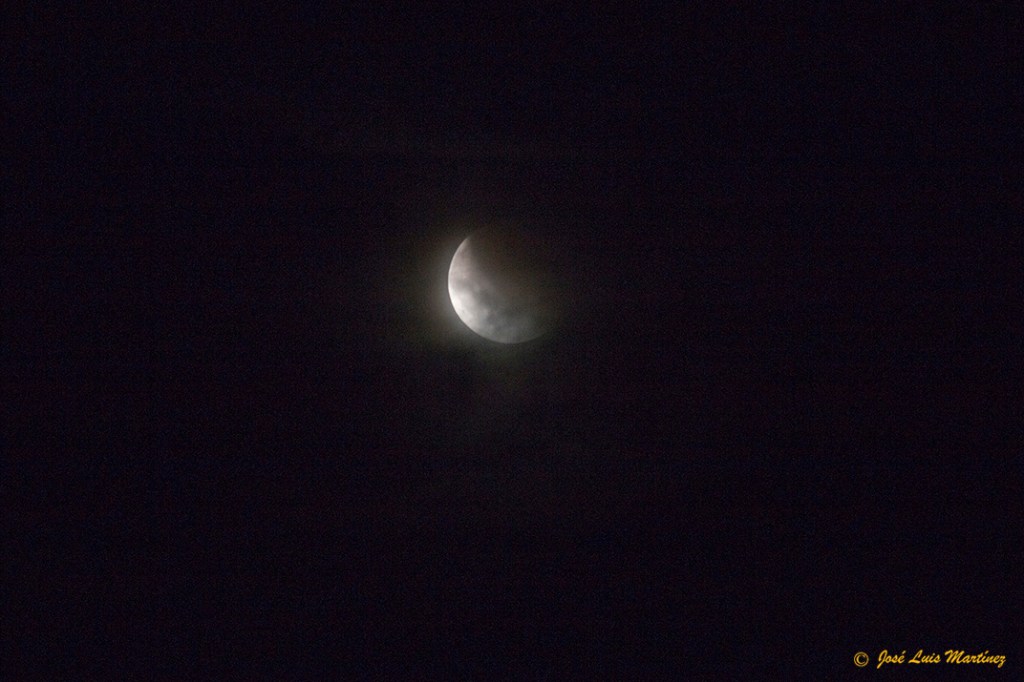 Si bien la mayoría de fotos las hice solamente de la Luna con el objetivo a 300 mm, como esta otra, realizada a las 21:18 y en la que pueden apreciarse las nubes, las cuales estuvieron a lo largo de todo el eclipse.