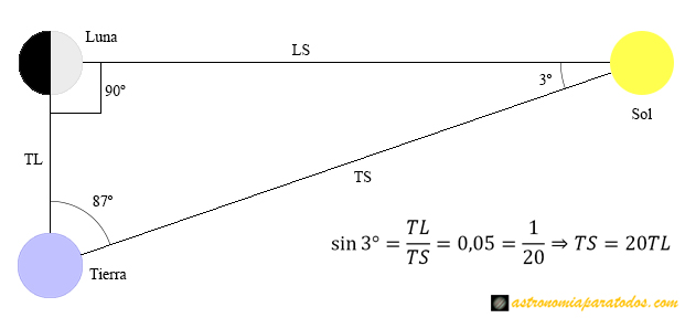 Si la Luna está en fase de cuarto, nuestro satélite, la Tierra y el Sol forman un triángulo rectángulo, donde las líneas Tierra-Luna (TL) y Luna-Sol (LS) forman el ángulo recto (catetos) y la línea Tierra-Sol (TS) es la hipotenusa. La razón o proporción en un triángulo rectángulo entre el cateto opuesto a un ángulo y la hipotenusa se conoce como seno del ángulo. Si consideramos el ángulo agudo que forman las líneas TS y LS, el seno de este ángulo es el cociente TL/TS.