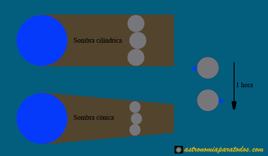 Ahora lo que hizo fue calcular el tiempo que tardaba la Luna, en un eclipse lunar total, en atravesar la sombra de la Tierra, esto es, desde que entraba en la sombra hasta que salía, viendo que era de tres horas. Es decir, que en la sombra de la Tierra, que según Aristarco era el tamaño real de la misma, cabían tres lunas, lo cual indicaba que la Tierra era tres veces el tamaño de la Luna o que ésta era 1/3 de aquella.