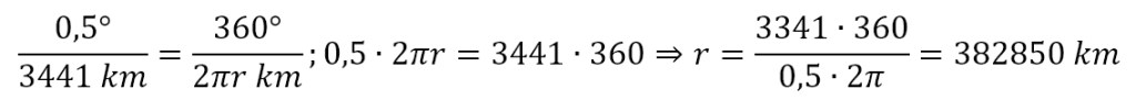 Una vez conocido el tamaño de la Luna, calcular la distancia no era complicado. Como Aristarco, Hiparco pensaba que la órbita de la Luna era circular, por lo que en 29,5 días recorría un espacio de 2πr, donde r era el radio de la órbita de la Luna, es decir, la distancia entre la Tierra y la Luna; simplemente era aplicar unas proporciones: si 0,5º corresponden a 3441 km (en las unidades de la época, estadios), 360º (toda la circunferencia) corresponderán a 2πr km: