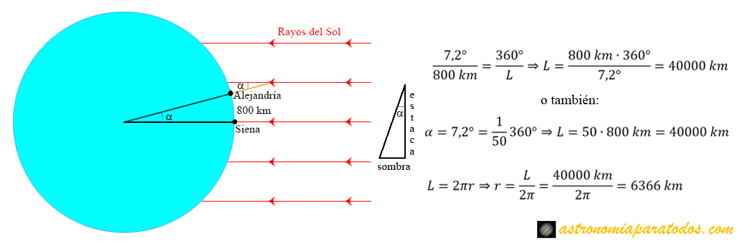 Y no se quedó aquí, ya que a partir de la fórmula de la longitud de una circunferencia a partir de su radio, dedujo que el radio de la Tierra era de unos 6366 km (diámetro 12732 km), muy acertado también, pues el radio en el ecuador es de 6378 km (diámetro 12756 km).