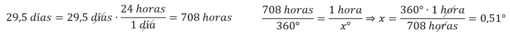 ¿Y cuánto era este diámetro, en este caso angular? Bien, él sabía que el tiempo entre dos fases iguales de la Luna (mes sinódico), era de 29,5 días. Aristarco, y hasta que Kepler no dijo que las órbitas eran elípticas, pensaba que la órbita de la Luna era circular. De esta manera concluyó que, si la Luna tardaba 29,5 días en completar una órbita (360º), en una hora completaría xº, que era, además, el diámetro angular la Luna. Es decir: