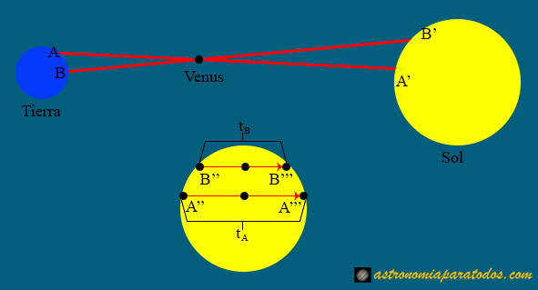 En la figura, el paralaje es la distancia angular entre A’ y B’, que es la misma que entre A″AIII y B″BIII. Por otro lado, tA es el tiempo que dura el tránsito de Venus desde la posición en la Tierra A y tB desde B.