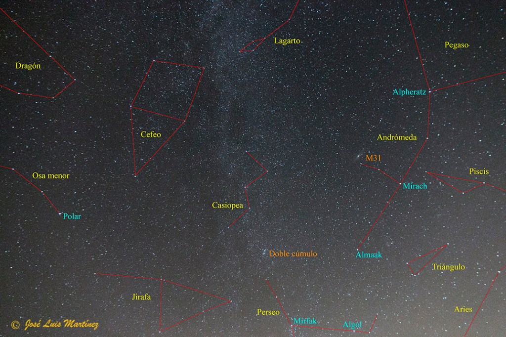 En la fotografía anterior, realizada desde Querol el día 17 de octubre de 2020 con una cámara Canon EOS 70D y un objetivo Canon 15-85, pueden observarse algunas constelaciones en la zona de Casiopea y muchas, muchas estrellas. También se ve parte de la Vía Láctea atravesando la imagen por el centro, de arriba a abajo, y dos objetos de cielo profundo que pueden verse a simple vista, en cielos oscuros, eso sí, la galaxia de Andrómeda y el doble cúmulo de Perseo.