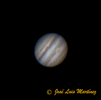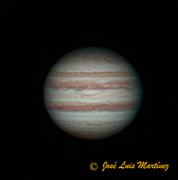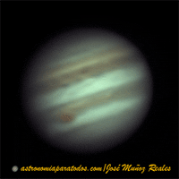 La animación de la derecha la hizo José Muñoz Reales, desde l’Hospitalet de Llobregat el 5 de junio de 2017. Además del planeta gigante, hay dos de los satélites galileanos, Io y Europa y sus sombras sobre Júpiter. La gran mancha roja también se ve perfectamente.