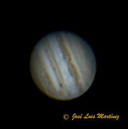 En la fotografía de la izquierda, hecha desde Cornellà de Llobregat el 24 de julio de 2009 con un telescopio reflector Celestron 150/750, una barlow 3X y una cámara Philips SPC900, puede verse la Gran Mancha Roja.