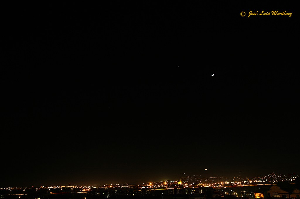 Júpiter se ve perfectamente desde cualquier cielo, aunque haya mucha contaminación lumínica y la Luna, como en la fotografía anterior, hecha desde Cornellà de Llobregat el 6 de febrero de 2011 con una cámara Canon EOS 30D y un objetivo Sigma 17-70.