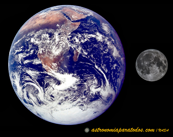En la imagen inferior puede verse la proporción de tamaño entre la Tierra y la Luna. En este montaje, la fotografía de la Luna es la misma que la de la Luna llena anterior, pero la de la Tierra, evidentemente, no es mía. Es la famosa The Blue Murble (La Canica Azul), como la denominó la NASA, realizada el 7 de diciembre de 1972 por la tripulación del Apolo 17.