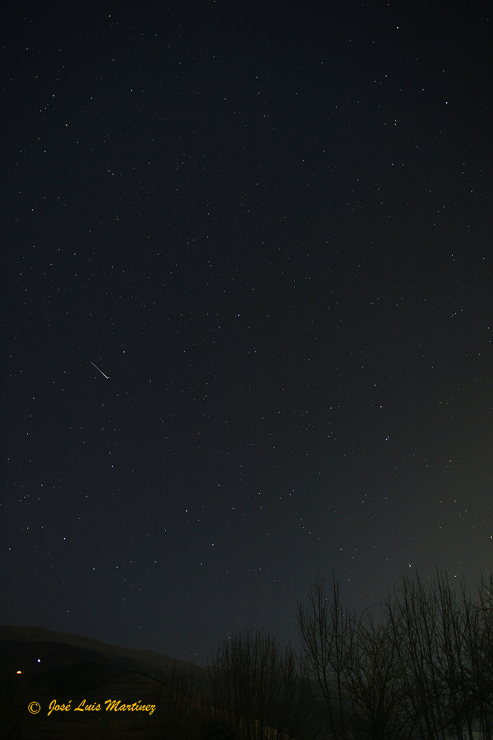 En la fotografía de la izquierda, realizada desde Sant Joan de les Abadesses el día 2 de marzo de 2012 con una cámara Canon EOS 30D y un objetivo Sigma 17-70, se puede observar una estrella fugaz o meteoro.