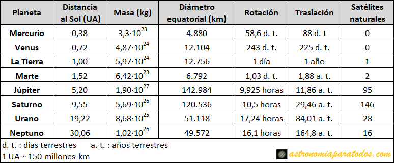 La tabla siguiente muestra las características principales de los ocho planetas del Sistema Solar.