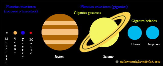 Los planetas están divididos en cuatro planetas interiores (o terrestres o rocosos), Mercurio, Venus, la Tierra y Marte y cuatro planetas exteriores (o gigantes), Júpiter, Saturno (gigantes gaseosos), Urano y Neptuno (gigantes helados).