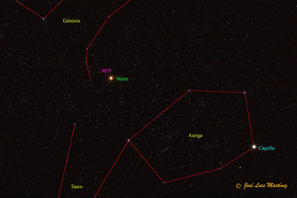 Este aspecto rojizo también puede verse si miramos el planeta sin ningún aparato óptico, a simple vista, como puede verse en las dos fotografías siguientes. La de la izquierda está hecha desde Cornellà de Llobregat el 22 de febrero de 2015 con una cámara Canon EOS 70D y un objetivo Canon 70-300, donde también está Venus, mucho más brillante. En la de la derecha, hecha desde Pujalt, en l’Anoia (Barcelona) el 8 de marzo de 2008 con una cámara Canon EOS 30D y un objetivo Sigma 17-70, el planeta rojo se encontraba entre las constelaciones de Géminis y la Auriga, muy cerca del cúmulo abierto de Géminis, M35.