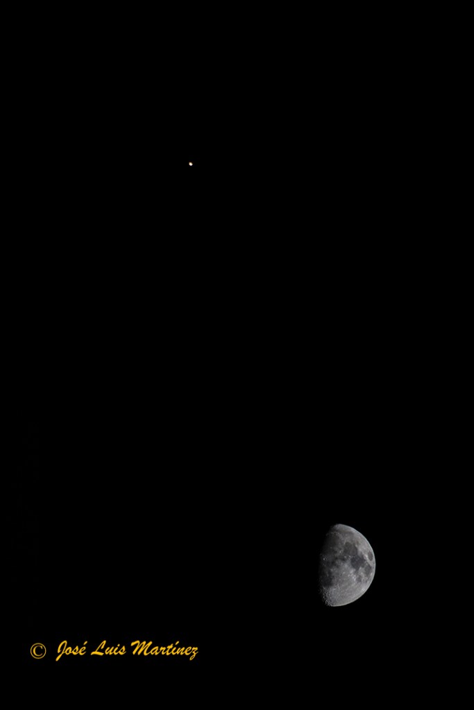 En la siguiente imagen, realizada desde Buira, en el Pallars Jussà (Lérida), el día 7 de junio de 2014 con una cámara Canon EOS 30D y un objetivo Sigma 70-300, puede verse la Luna gibosa creciente de 9 días y, hacia arriba y a la izquierda, Marte.