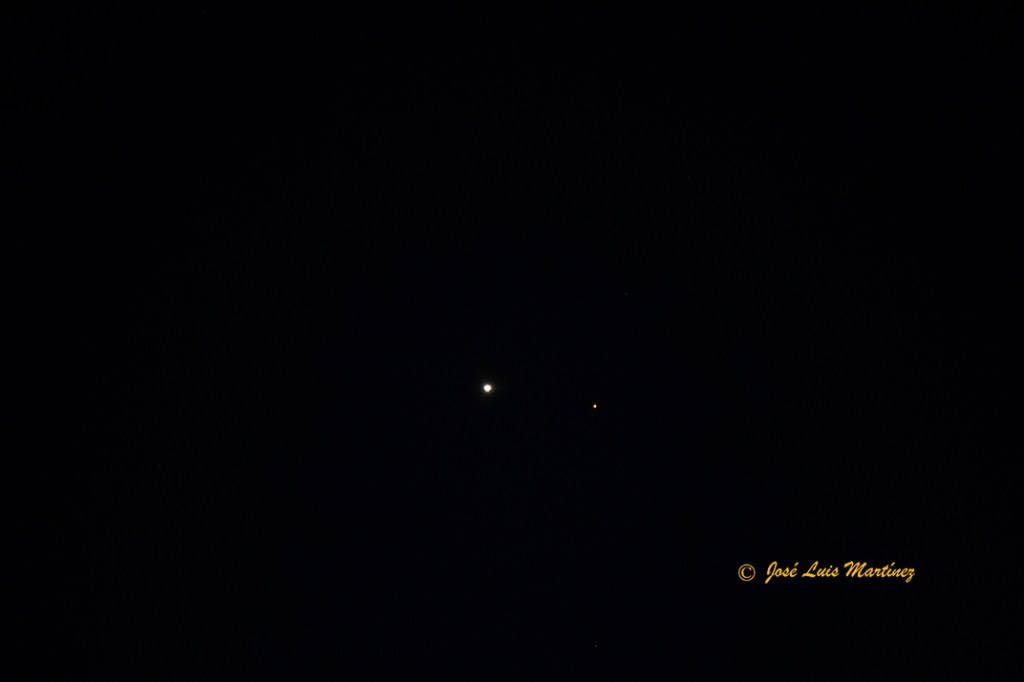 En la imagen siguiente, realizada desde Cornellà de Llobregat, el día 20 de febrero de 2015 con una cámara Canon EOS 70D y un objetivo Canon 70-300, podemos observar la Luna creciente de un día con la luz cenicienta, Venus, un punto brillante hacia arriba y a la izquierda y Marte, un puntito más débil que Venus por encima y a la derecha de éste.