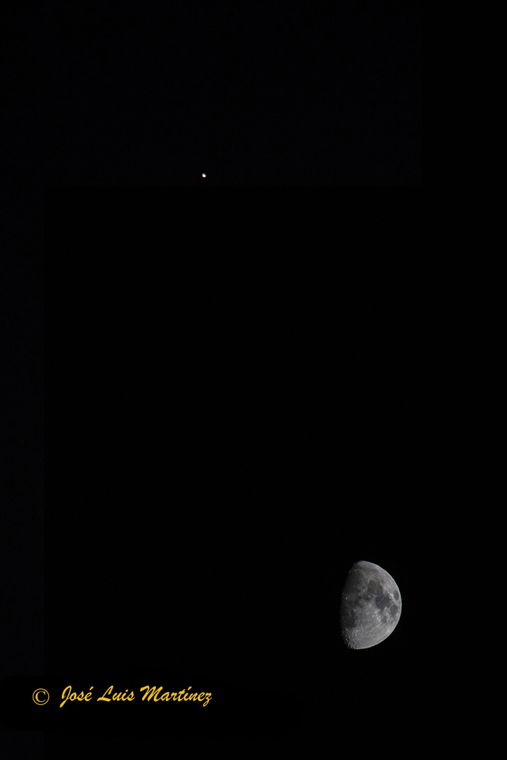 En la siguiente imagen, realizada desde Buira, en el Pallars Jussà (Lérida), el día 7 de junio de 2014 con una cámara Canon EOS 30D y un objetivo Sigma 70-300, puede verse la Luna gibosa creciente de 9 días y, hacia arriba y a la izquierda, Marte.