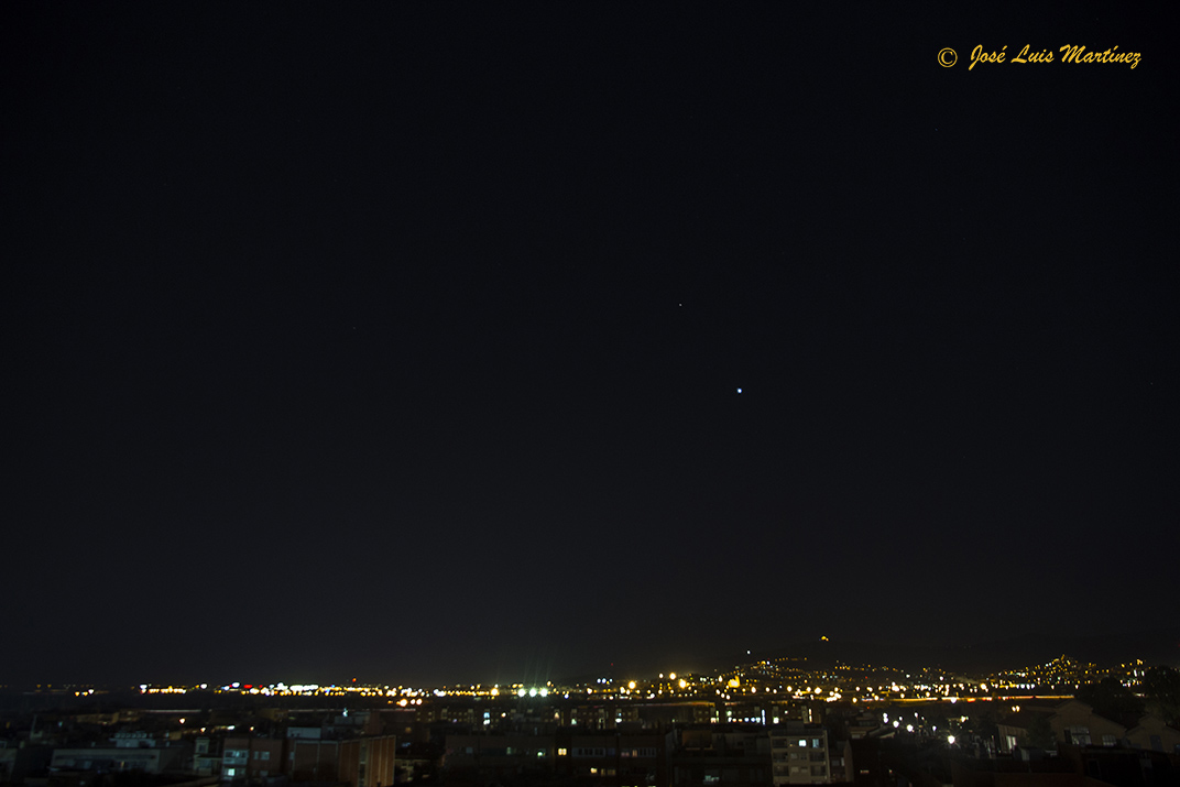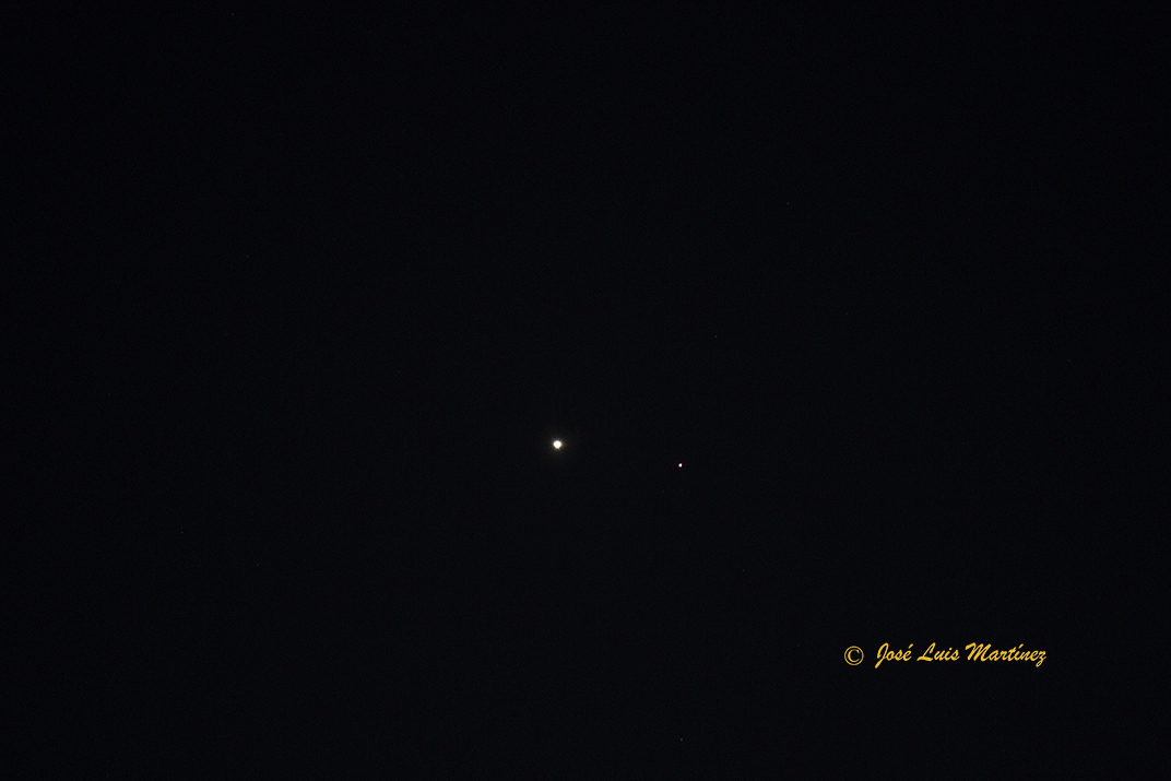 En la imagen siguiente, realizada desde Cornellà de Llobregat, el día 20 de febrero de 2015 con una cámara Canon EOS 70D y un objetivo Canon 70-300, podemos observar la Luna creciente de un día con la luz cenicienta, Venus, un punto brillante hacia arriba y a la izquierda y Marte, un puntito más débil que Venus por encima y a la derecha de éste.
