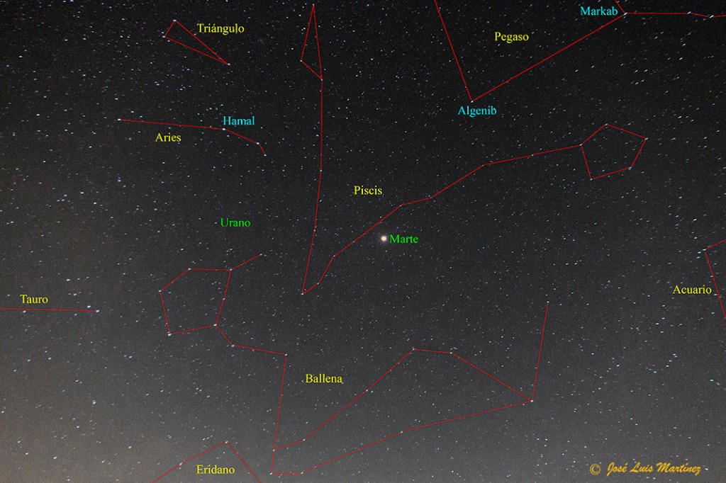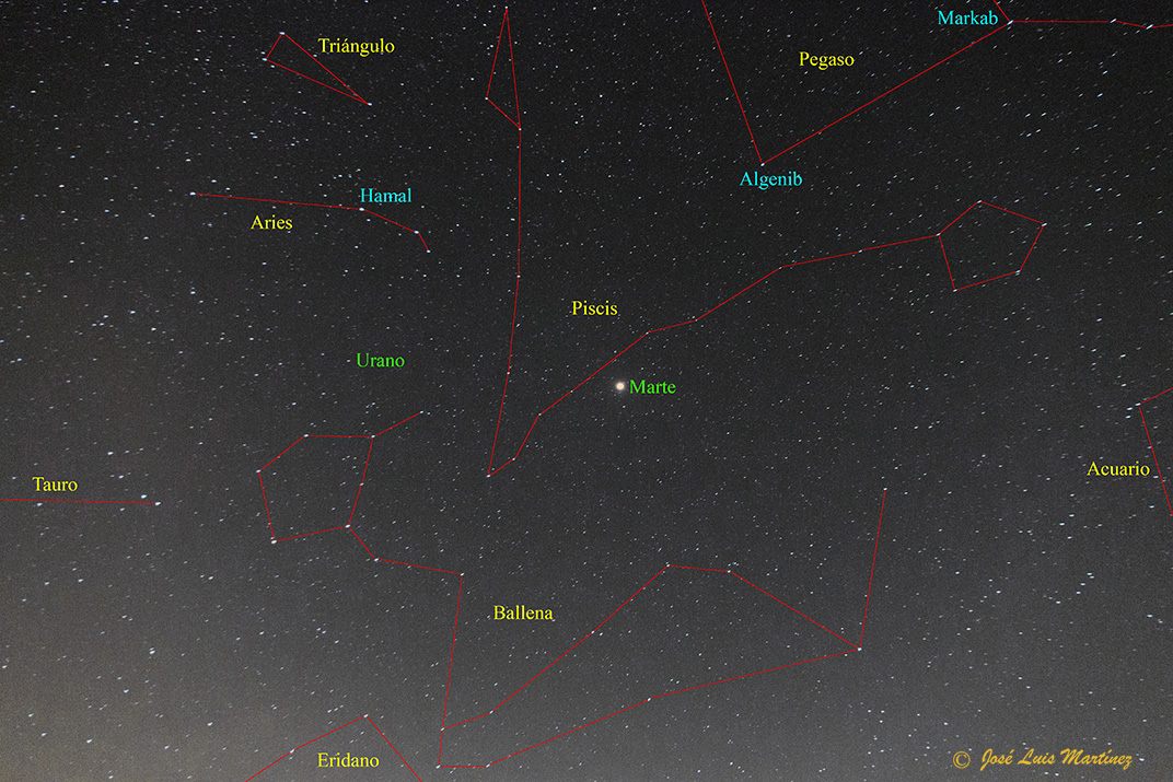 En la imagen siguiente, realizada desde Querol el día 17 de octubre de 2020 con una cámara Canon EOS 70D y un objetivo Canon 15-85, puede verse Urano entre las constelaciones de la Ballena, Aries y Piscis. Si bien es observable, a simple vista se confunde fácilmente con una estrella, no así Marte, que también se ve en la imagen en la constelación de Piscis.