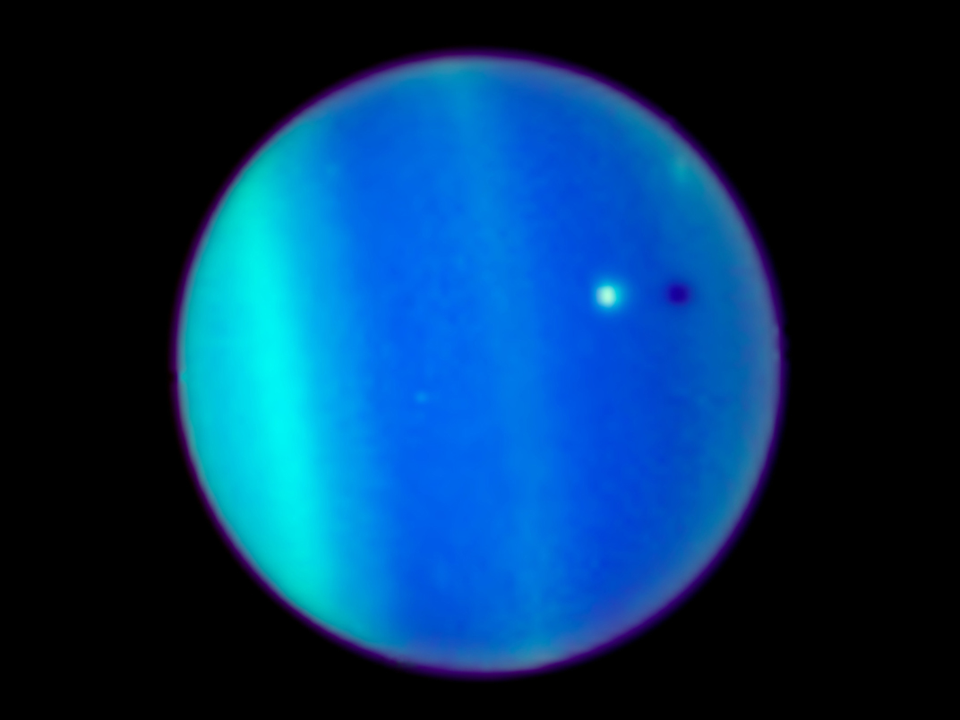 También se observa su cuarta luna mayor, Ariel, en tránsito sobre Urano (círculo blanco pequeño en la zona derecha) y la sombra de la misma sobre el planeta (círculo negro pequeño a la derecha de Ariel).