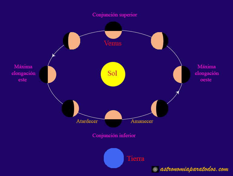 Venus, y también Mercurio, por ser un planeta que está entre el Sol y la Tierra, siempre lo vemos en las inmediaciones del Sol, lo que hará que también siempre lo veamos o en el amanecer o en el atardecer. Pero además, el hecho que esté entre la Tierra y el Sol, hace que nos presente fases como la Luna.